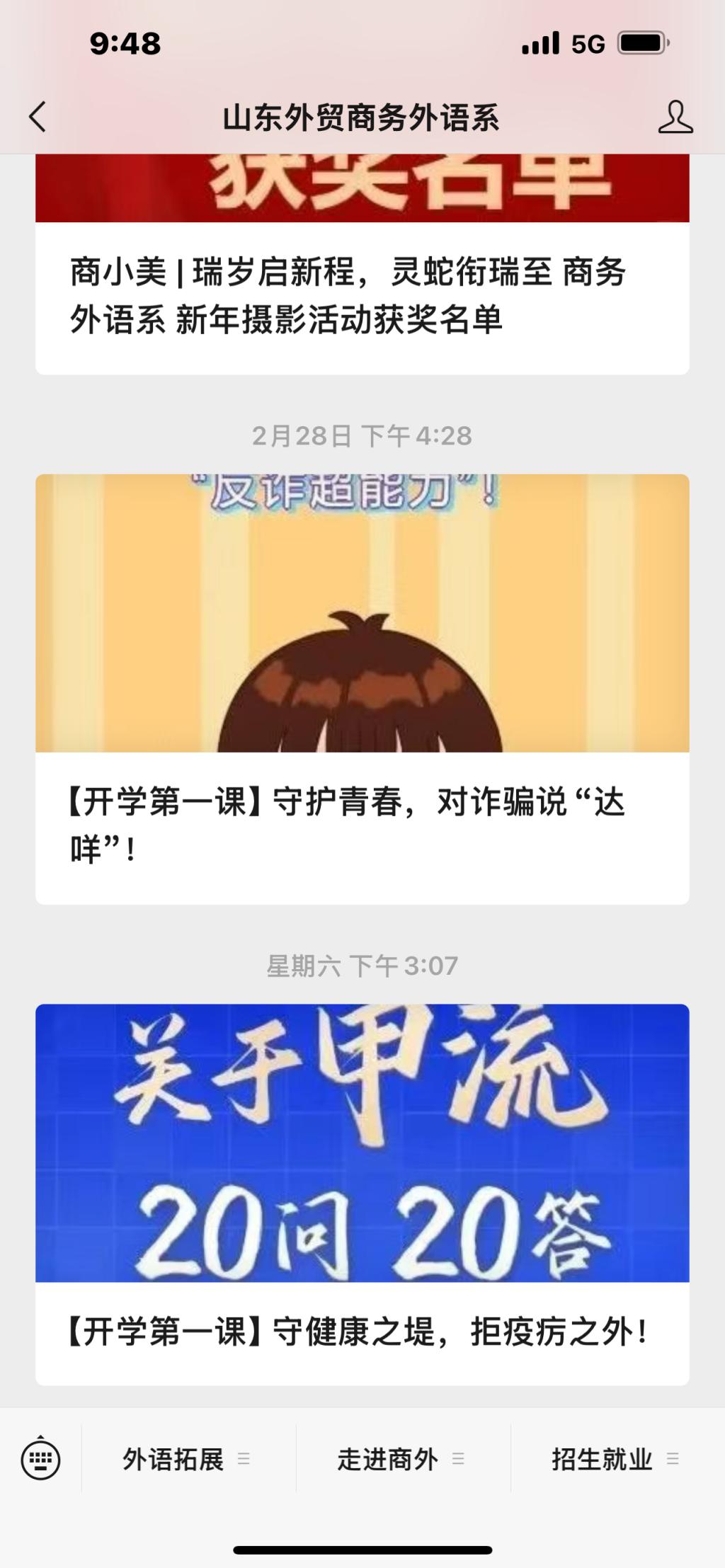 商务外语系通过公众号发布了《守护青春,对诈骗说达咩》《守健康之堤,拒疫疠之外》等系列推文,结合真实案例,深刻揭露了境外高薪诱骗、网络刷单等新型诈骗手段,以“高薪陷阱揭秘+防诈技能指南”双模块内容增强警示效果。