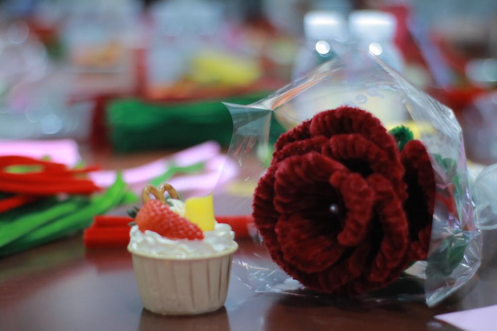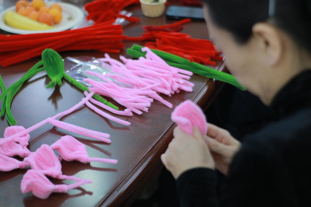 绒花又称宫花、喜花,以蚕丝和金属丝作为原料制作而成,是中国传统非遗技艺之一,寓意吉祥富贵,蕴含着丰富的中华传统文化内涵。此次活动创新性地采用扭扭棒作为材料,既保留了绒花的传统韵味,又极大地简化了制作流程,让非遗文化焕发新的生机。