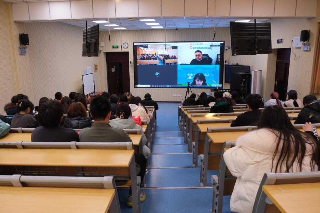 Sonia·Adeva首先向同学们介绍了西班牙的民俗风情、传统节日和教育情况。其以生动风趣的语言,为同学们带来了一堂精彩的西班牙文化课。随后,她详细介绍了阿尔卡拉大学悠久的历史与深厚的文化传统,以及阿尔卡拉大学的教育优势。目前正在西班牙访学的潘修娜老师也结合自身经历,向同学们分享了访学期间的生活和学习经历。
