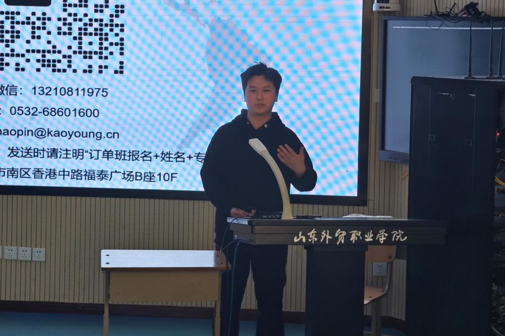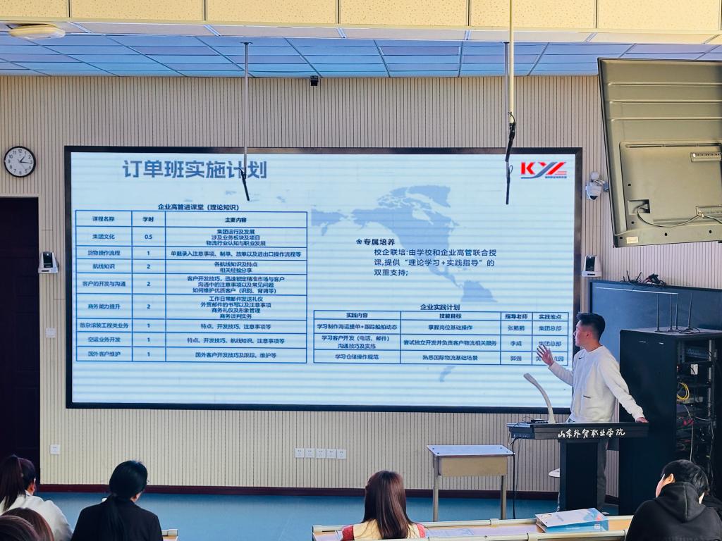 两家公司负责人详细介绍了企业概况、岗位设置、薪资待遇,并着重说明了订单班实施计划。根据计划,本学期将由学校和企业携手,由企业高管和专业教师联合授课,为学生提供“理论学习+实践指导”的双重支持,下学期,学生将正式进入企业开展真实业务实践。