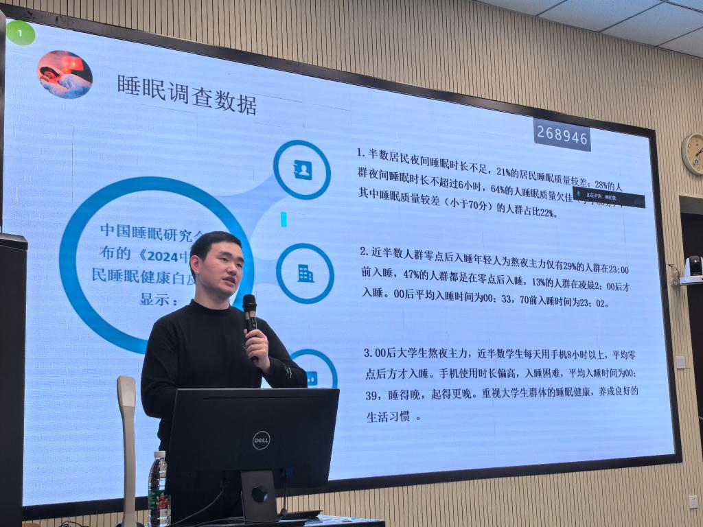 张作庆以《健康睡眠 人人共享》为题,介绍了睡眠的科学基础,解析了常见的失眠原因、危害及应对策略,讲授了诸如作息时间优化、睡眠环境改善、睡前放松训练等科学睡眠方法与技巧。现场还设置了健康睡眠十问十答互动环节,学生们踊跃提问,张作庆结合临床医学与心理学知识深入浅出地讲解答疑,帮助大家掌握助眠技巧,提供全面且个性化的睡眠健康指导。