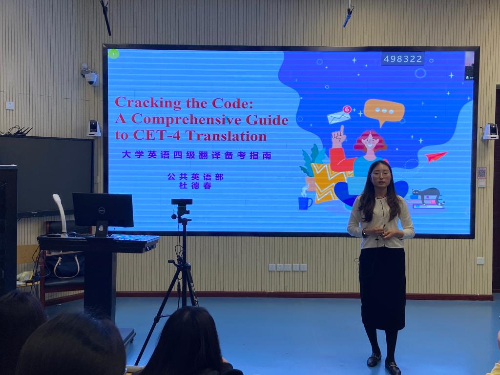5月7日下午,第十六届英语文化节“文化体验”系列讲座之“大学英语四级翻译备考”在青岛校区顺利举行。本次讲座由公共英语部教师杜德春主讲。