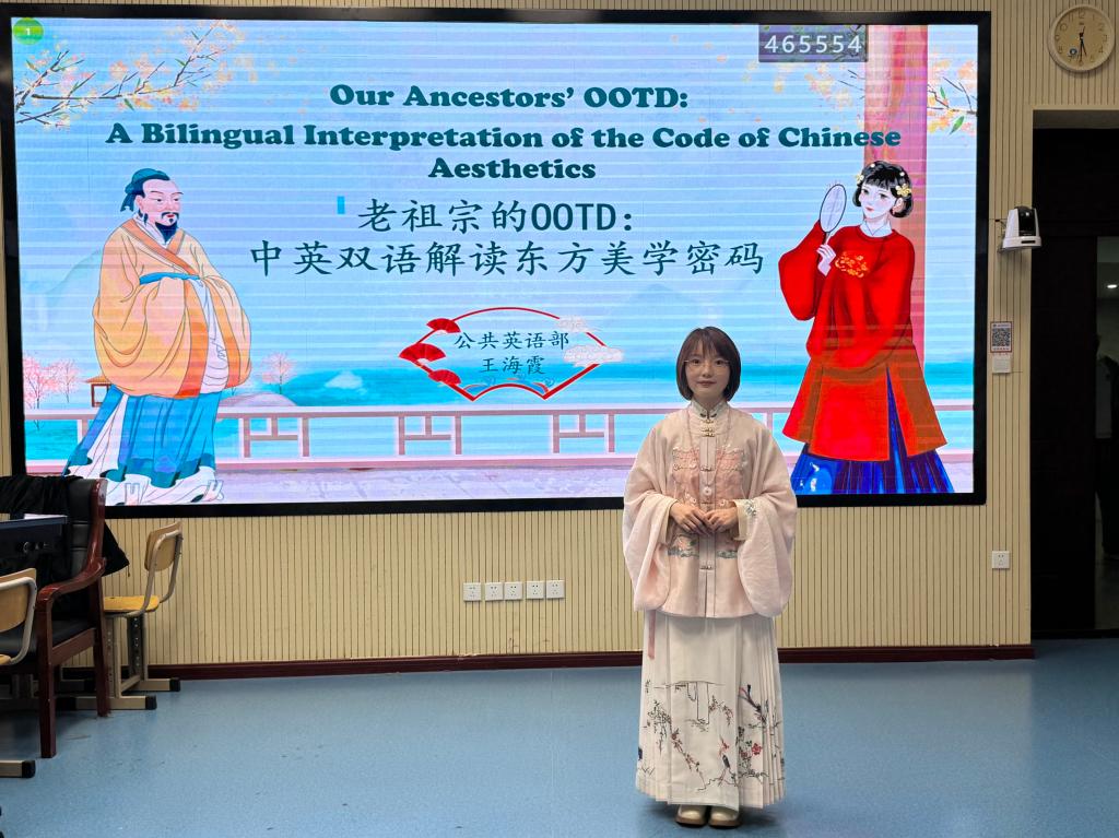 本次讲座的主题是“老祖宗的OOTD:中英双语解读东方美学密码”。王海霞以传统服饰马面裙的名称渊源为引,带领学生深入探究“汉服”概念的精准定义,并通过实物展示,让学生直观感受汉服的独特魅力与基本特征。随后,她还介绍了各朝代汉服的形制演变;从色彩搭配、纹样寓意、布料质感、剪裁工艺等维度,深度解析汉服中蕴含的中式美学精髓。最后,王海霞结合现代生活场景和四季汉服穿搭范例,为学生们展示了传统文化如何在当下呈现出无限新活力。她强调汉服承载着千年历史底蕴,是珍贵的文化瑰宝之一,身着汉服是对传统文化最生动的传承。