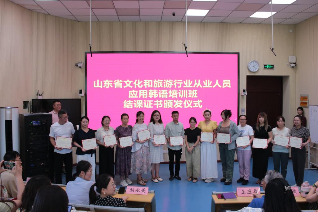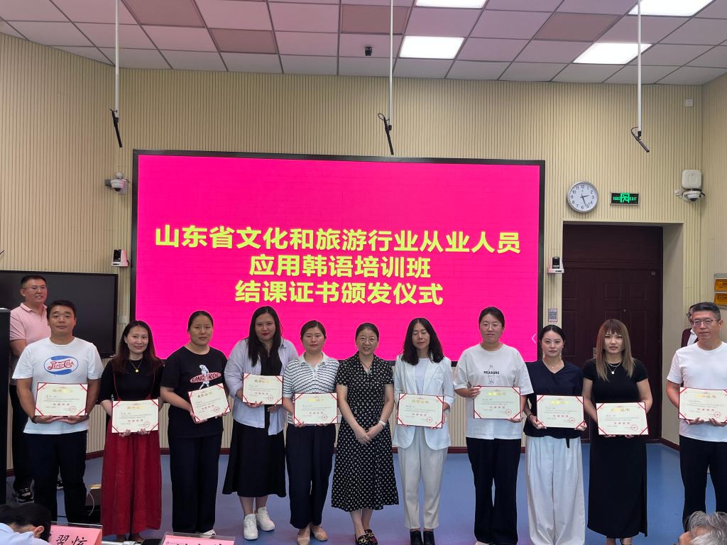 本次培训班设置了韩语基础、日常对话、导游实务和综合实训等教学模块,采用“中外教联合”模式,重点培训学员的韩语日常应用能力和导游服务能力。自6月11日开班以来,共完成200课时的线下授课和实训,顺利完成全部设定培训任务,取得了良好的培训效果,受到山东省文旅厅、青岛市文旅局和参训学员的一致肯定。