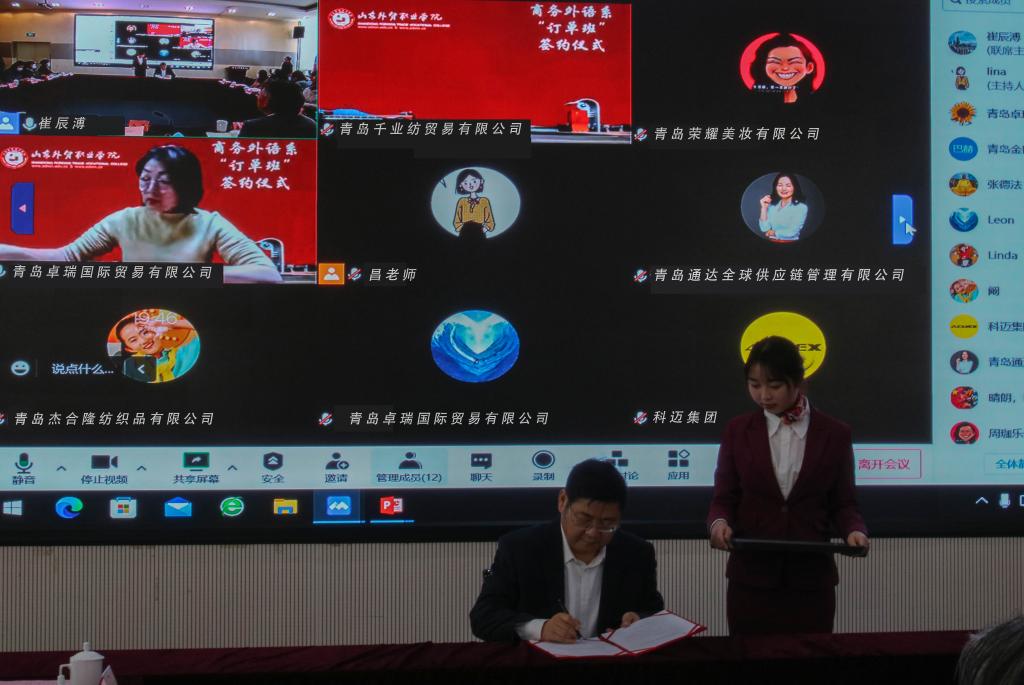 12月1日下午,伟德在图书馆四楼会议室与青岛卓瑞国际贸易有限公司、青岛金巴赫国际物流股份有限公司等十家订单班企业联合举行订单班线上签约仪式。学院副院长高成,招生办公室、校企合作办公室负责人,商务外语系党政领导及各专业带头人,冠名班辅导员、班主任及学生代表参加了仪式。十家企业负责人线上参加了仪式。